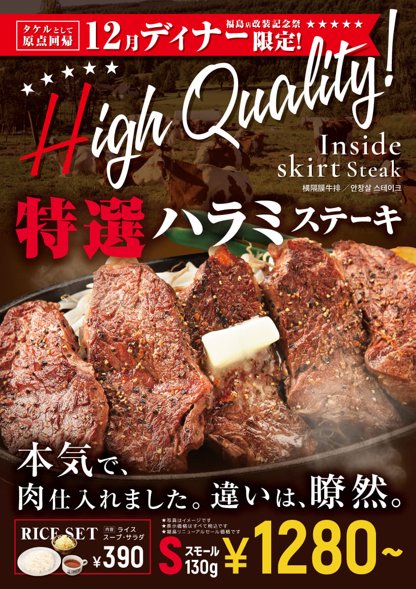 12/13(土)〜30(火)の間、ディナー限定(17:30〜)で特選ハラミステーキを開催!