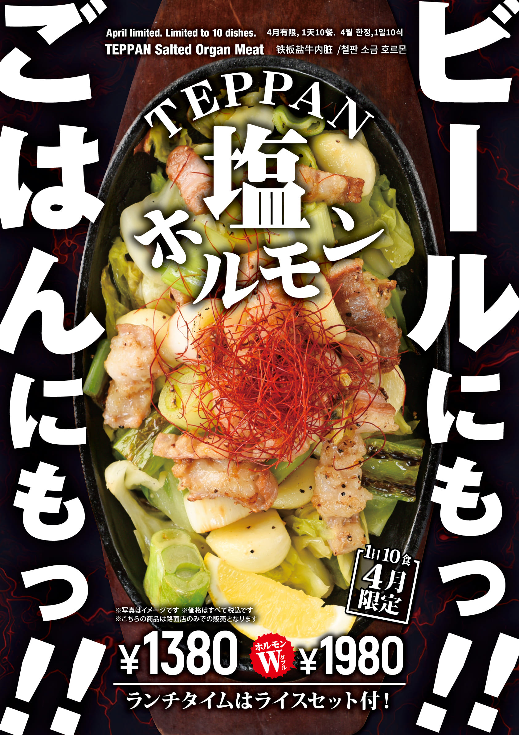 【価格】鉄板塩ホルモン1,380円/ホルモンW(ダブル)1,980円